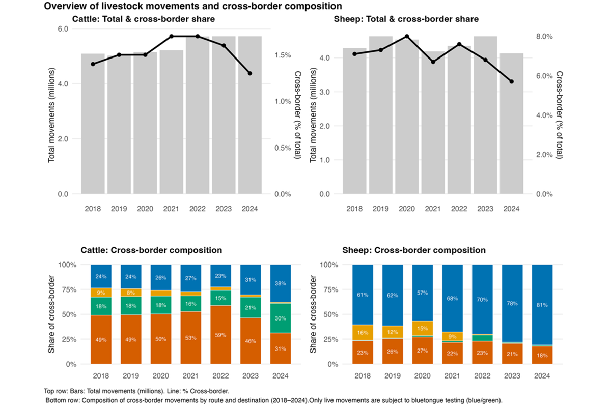 Figure 1. Top panels show total annual livestock movements (millions; grey bars, left axis) and the proportion of movements that are cross-border into Scotland (black line, right axis) for cattle (left) and sheep (right). Note that cross-border movements represent a small proportion of total movements, particularly for cattle. Bottom panels show the composition of cross-border movements by route and destination, including movements to live via markets (blue), direct to live (green), and movements direct to slaughter (orange) or via a market to slaughter (yellow). Only live cross-border movements (blue and green) would potentially be subject to testing.