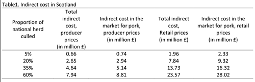 For Scotland, the indirect cost following an outbreak of ASF is mainly driven by the revenue lost in the market for pork. However, total indirect costs are partly offset by increased revenue in other markets. This may be driven by a change in consumer demand for substitute products. Increased demand leads to increased retail prices; hence the consumer ends up paying more for all goods.
