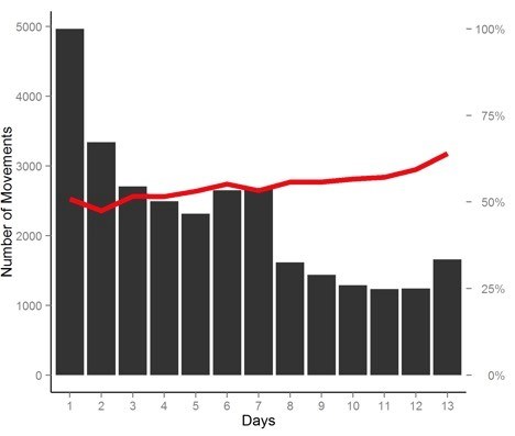 Figure 1. Movements (for years 2011-2013) occurring during the standstill period. Red line: proportion of movements that appear exempt (percentage scale on the right).
